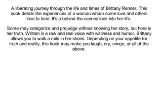. This book details the experiences of a woman whom some love and others love to hate. A liberating journey through the life and times of Brittany Renner. 9134AAQBAJ44 - Read and download Brittany Renners book Judge This Cover in PDF EPub Mobi Kindle online.